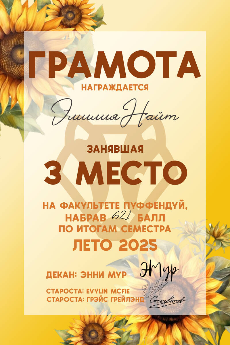 Второе место на Пуффендуе в этом семестре заняла Марин Сифур, невероятно старательная волшебница! Не останавливайся в своих больших достижениях)