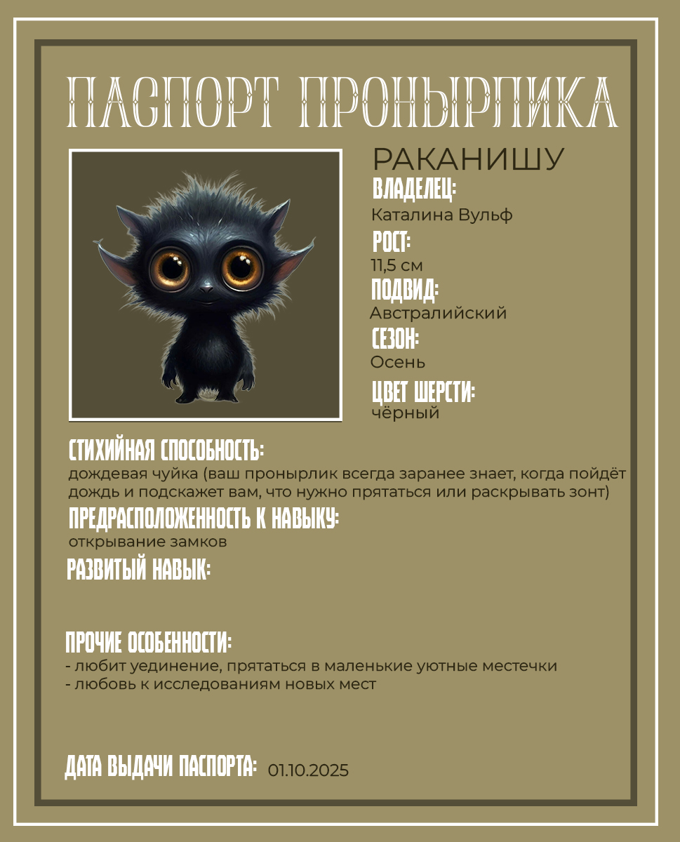 - Придумайте, как могут и могут ли вообще пронырлики помочь во взаимодействии с каким-то представителем тёмной магии или тёмным существом, учитывая информацию о пронырликах, приведённую в общих сведениях. Напишите рпг-пост на ГФ или Пуффендуе размером от 1000 символов.Стадия 3. Малыш в гнезде
