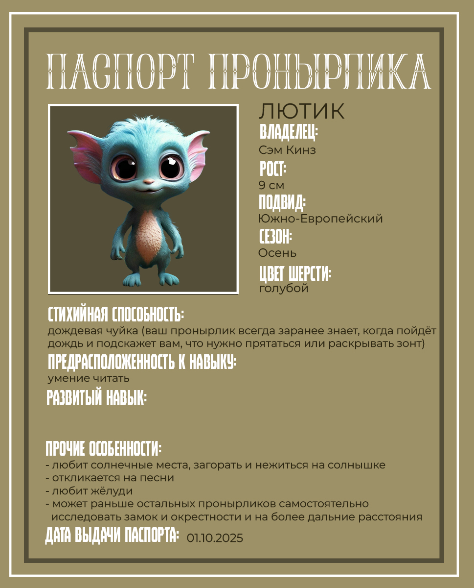 - Придумайте своё зелье, учитывая информацию о пронырликах, приведённую в общих сведениях. Напишите рпг-пост на ГФ или Пуффендуе размером от 1000 символов.Стадия 3. Малыш в гнезде