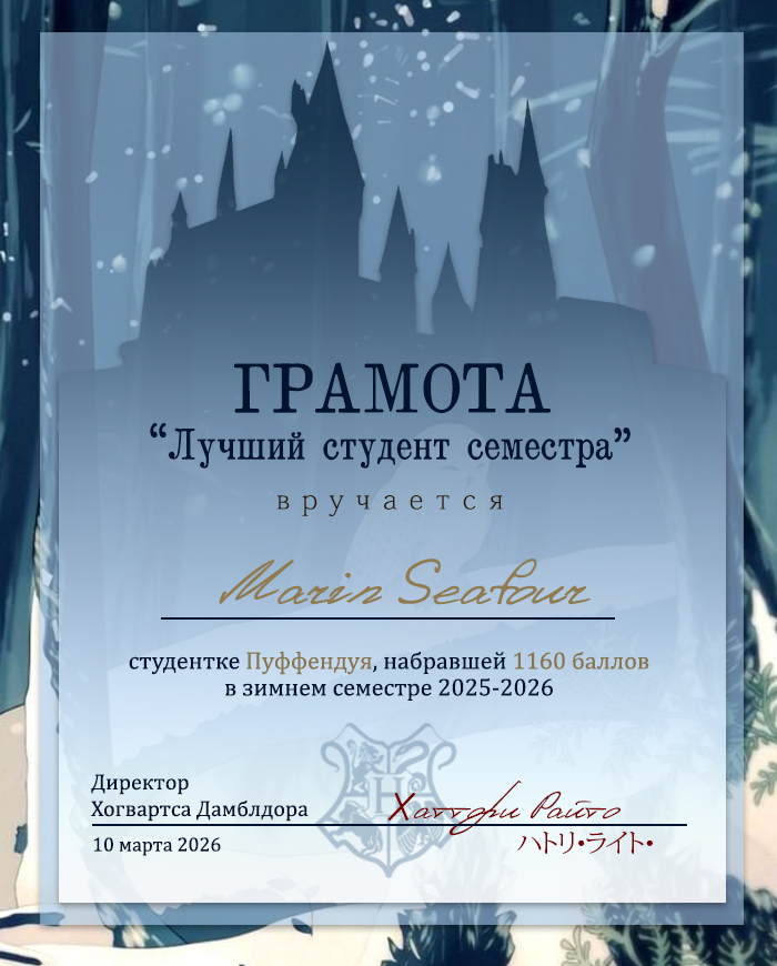 Знак отличия за самую высокую успеваемость получила Marin Seafour! Поздравляем нашу дорогую волшебницу с такой блистательной учёбой и желаем дальнейшего уверенного магического развития.